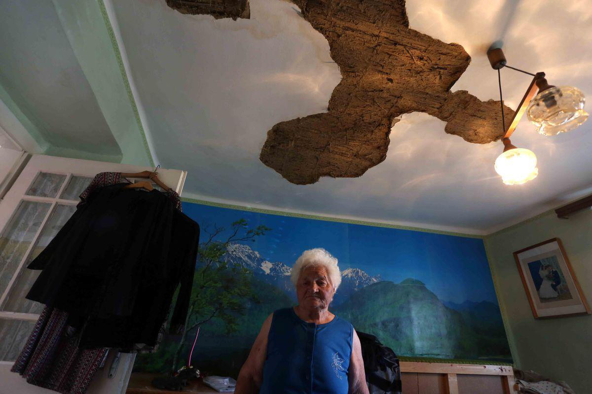 „Húzgáltuk Karcsika ágyát, hogy ne legyen vizes. Hoztam a vödröket, de aztán már csak álltam, és sírtam.” A plafonról leszakadt a vakolat, a víz elöntötte a szobákat: a szőnyegek tönkrementek, a szekrényben eláztak a ruhák, csak a konyha és a fürdőszoba maradt épen. A falról és a plafonról pereg, mállik a száradó vakolat, sár és vályog. „A lányom és a fiúunokám segített eltakarítani, amit tudtunk, most be van fedve a tető, félig azzal a fóliával, amit mi vettünk, félig azzal, amit a katasztrófavédelem adott. De ha jön még egy eső, nem tudom, kibírja-e.”