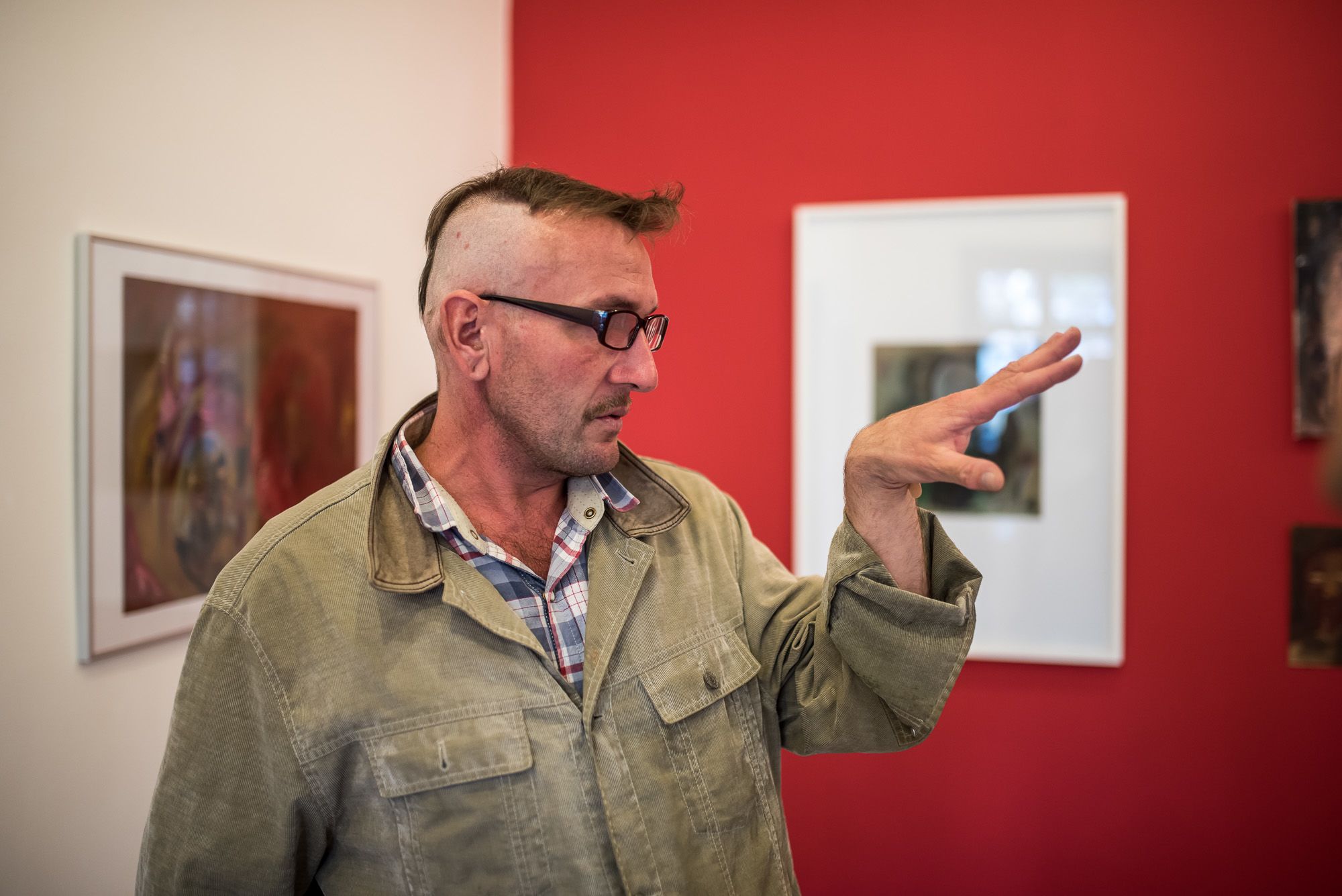 Amikor belépek, egy pillanatig átverve érzem magam: elsőre úgy tűnik, csoportos kiállítás ez, a falon a legkülönbözőbb stílusú és technikával készült képek, nem létezik, hogy mindegyik kéz ugyanahhoz az emberhez tartozik. „Pedig de – nyugtat meg Torma Tamás, a fesztivál sajtósa –, ez ő, mindegyik képe teljesen más, és mindegyik kiemelkedő a maga módján, nézd ezt a sárgát! Nézd ezt a kutyát! Nézd ezt az arcot, már ha megtalálod!” Torma nemcsak hivatalból lelkes, a képek tényleg olyanok, mintha egy hatvanéves életmű különböző fázisait képviselnék, pedig nem, a best of csupán az utóbbi pár év termése. „Tamás valahogy képes volt arra, hogy nem ragadt le egy stílusnál, nincs védjegye.” Legfeljebb az, hogy minden képe egyszerre szomorú és groteszk.