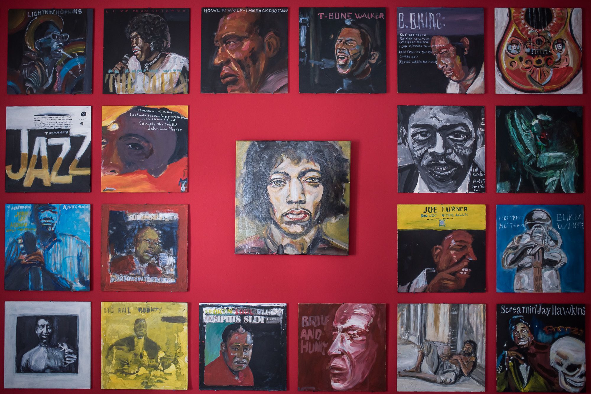 A zenés képeket könyvekből és az eredeti albumokról másolta, liberálisan értelmezve a lemezborító-portré fogalmát, szereplői eltúlzottak, furcsák, de sosem karikírozza őket. Mind más-más technikával készült, ha elfogyott egy szín, kombinált a meglévőkből, előnyére kovácsolva a nélkülözést. A zenékhez persze kötődik is, a kezdetektől megvan neki a jazz- és bluestörténet, az összes vadhajtásával a mai R&B-ig, gengszterrappig és Leonard Cohenig. Ha más nem is, az kiderül szavaiból, hogy rengeteget olvas.