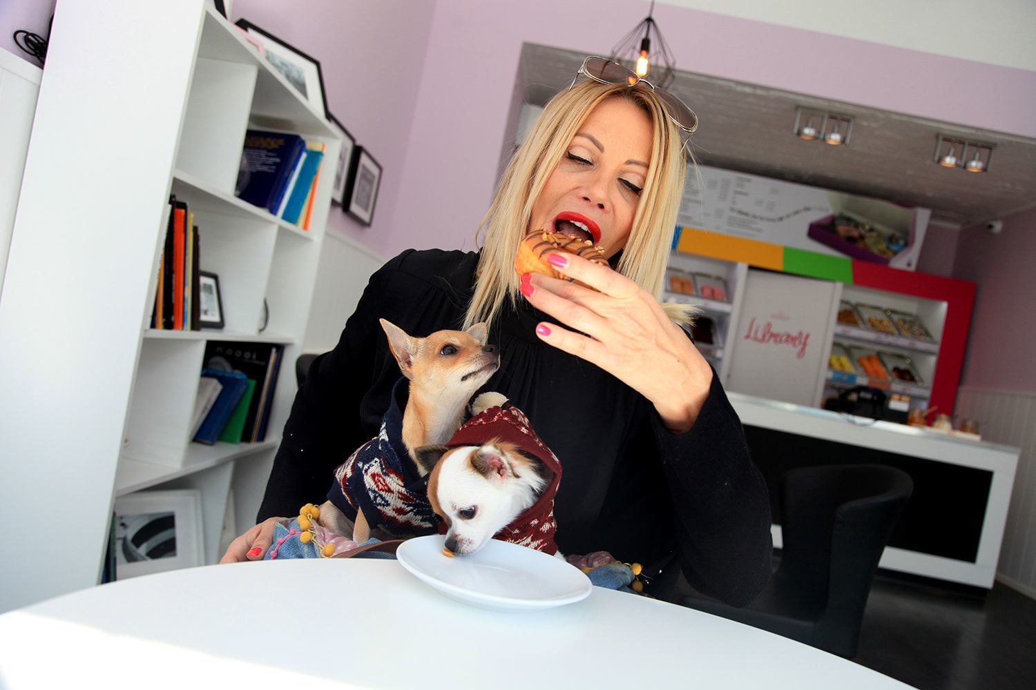 És tényleg együtt esznek. Először a kutyusok lenyalogatják a mogyoródarabkákat a fánkok tetejéről, majd anya egy nagyot harap a hiányos édességbe. Ekkor vált bennem biztossá, hogy Zita valóban embertársaiként tartja számon a két kis állatot.