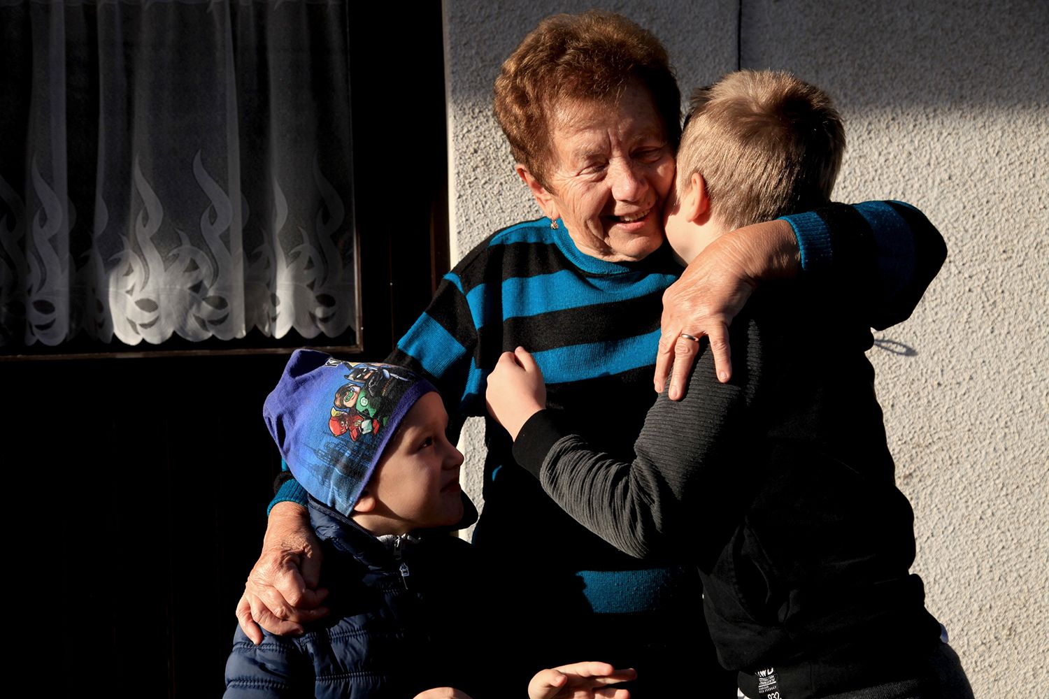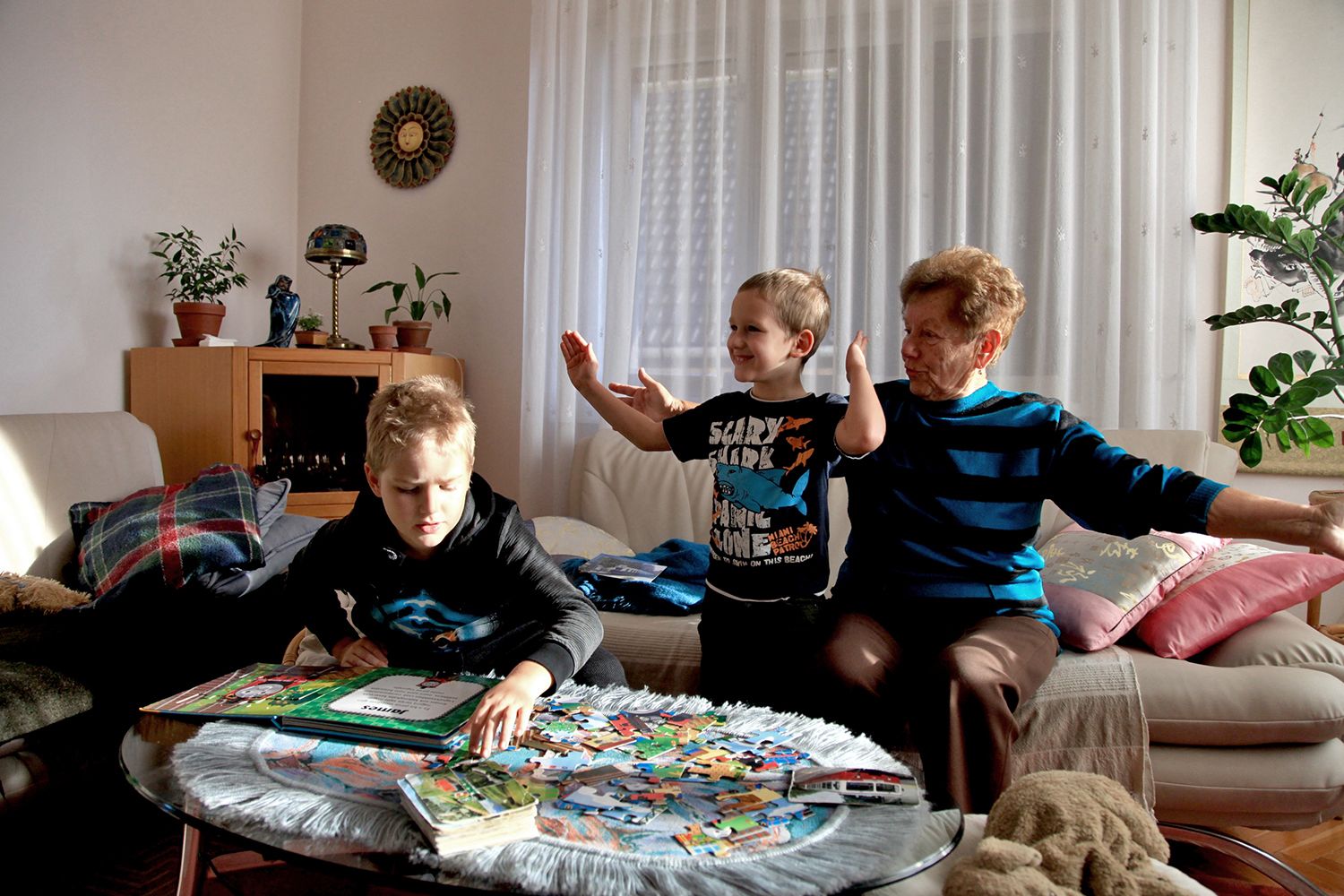 Erzsi mama, Áron és Bazsi összeszokott trió. A gyerekek rendszeres látogatói „fotós maminak“ – így szólítják a dédit, mert folyton kamerával a kezében követi őket.