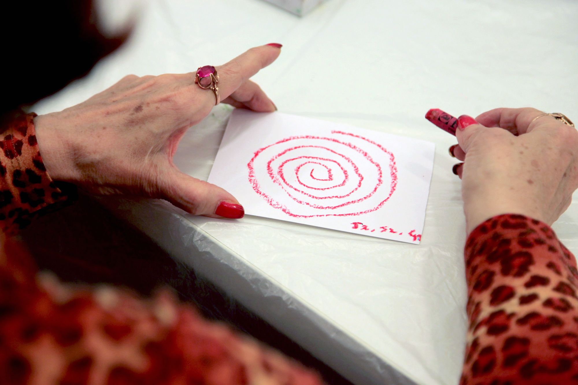 Az első feladat egy kis mandala elkészítése. Körözni kell egy kis lapon befelé, kifelé. És közben Viktória azt kéri a résztvevőktől, mindenki érezze át, hol a legkényelmesebb neki a körözés. Többen azt mondják, hogy a kör belsejében érezték jól magukat.