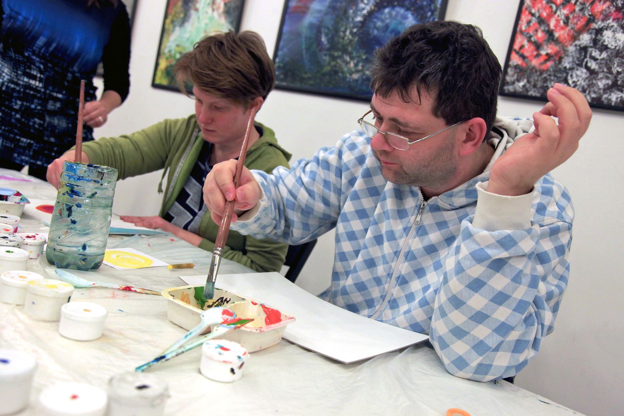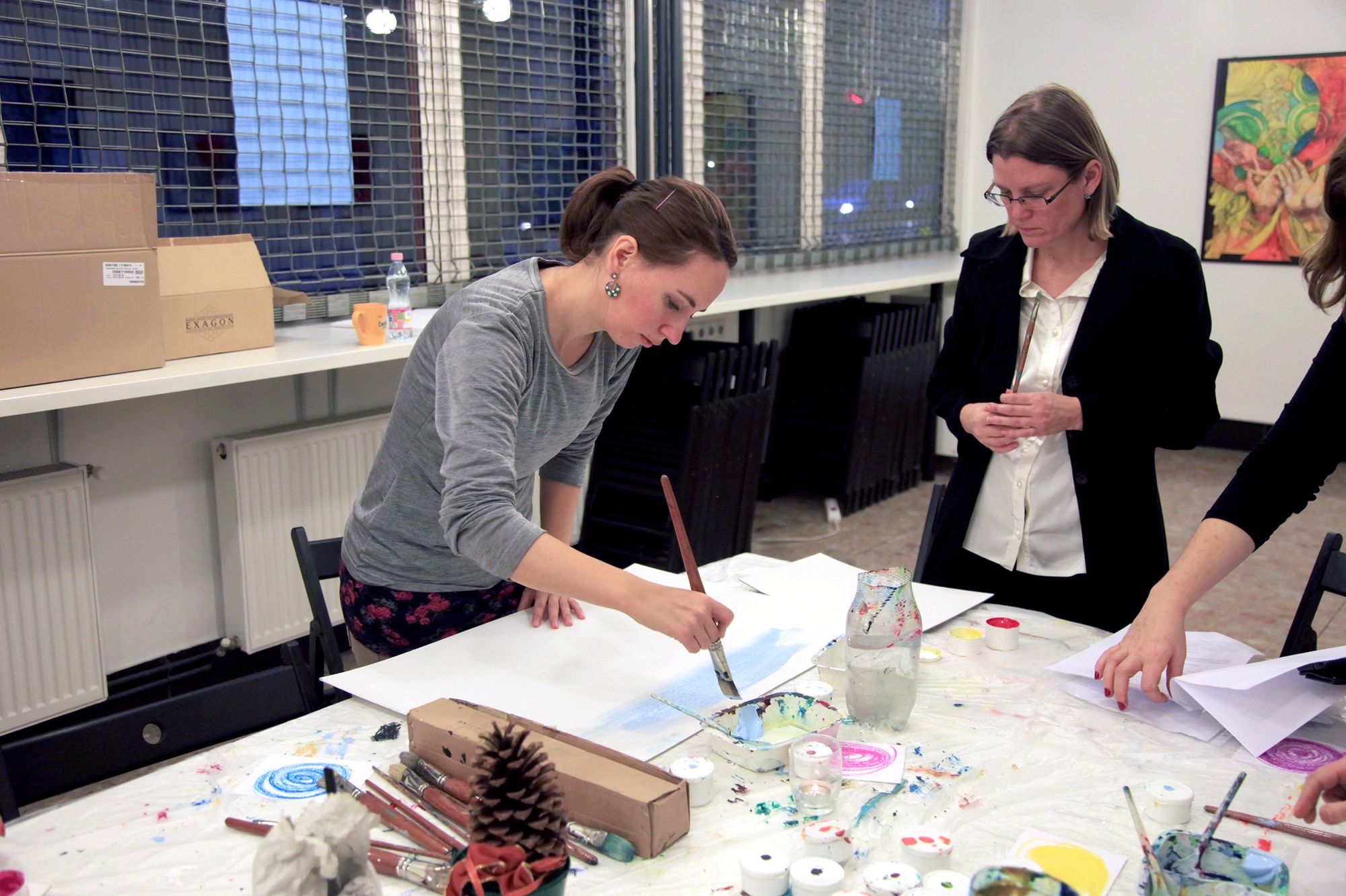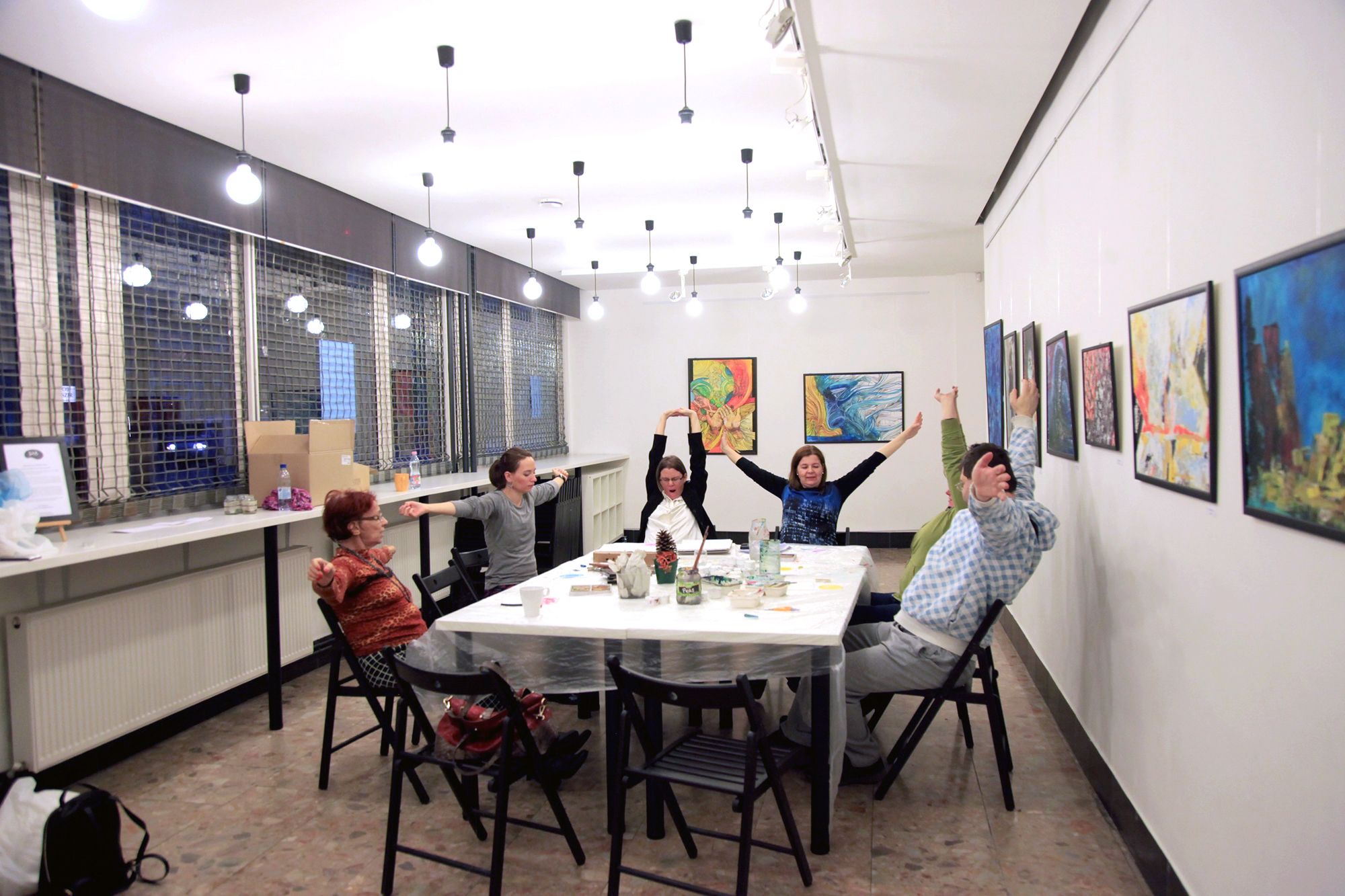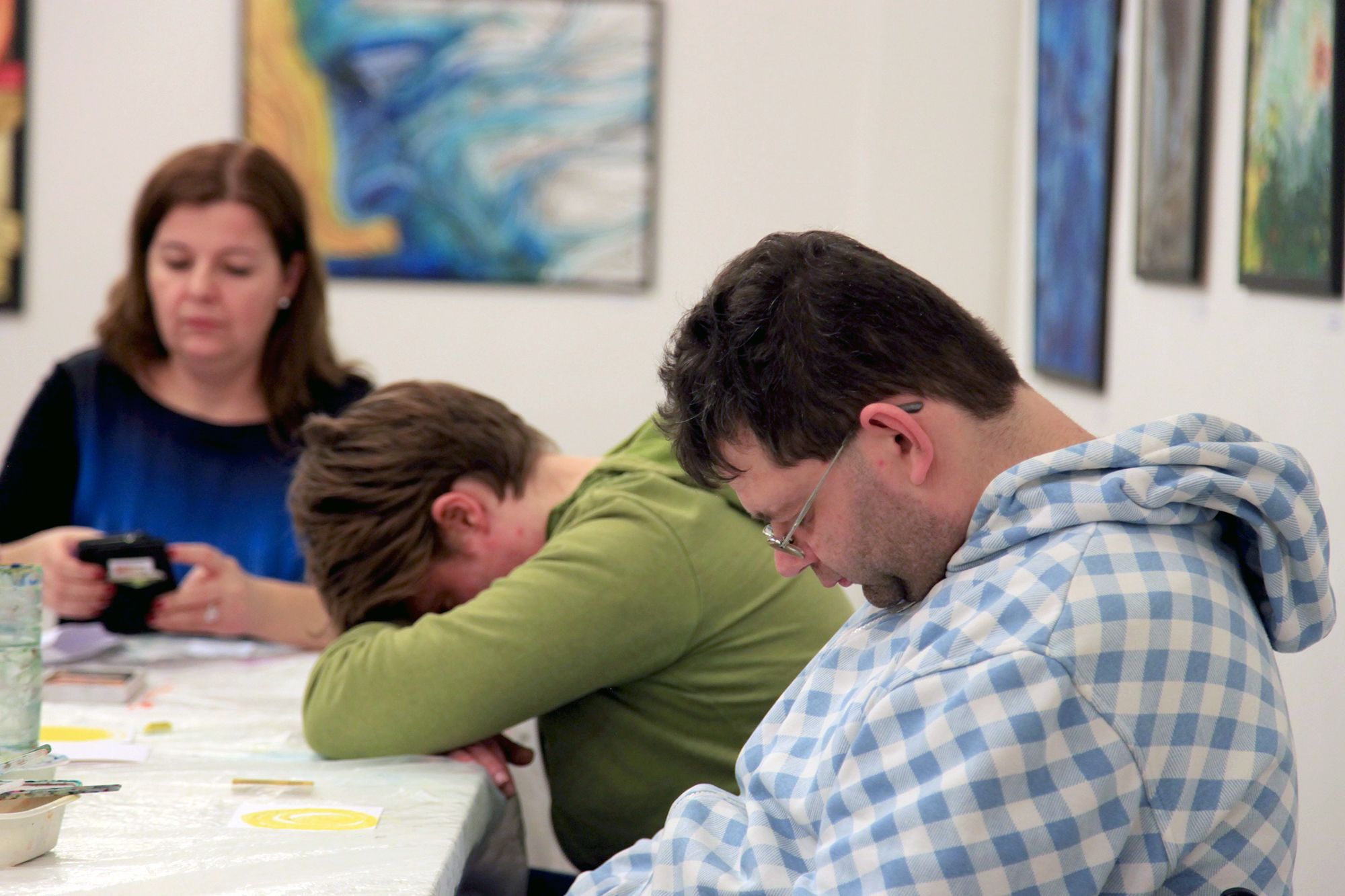 Kerényi Viktória vezeti a foglalkozást, türelemmel és odafigyeléssel beszélget mindenkivel. Miután kiosztja a festékeket, mindenkitől megkérdezi, milyen napja volt, hogy érkezett a foglalkozásra.