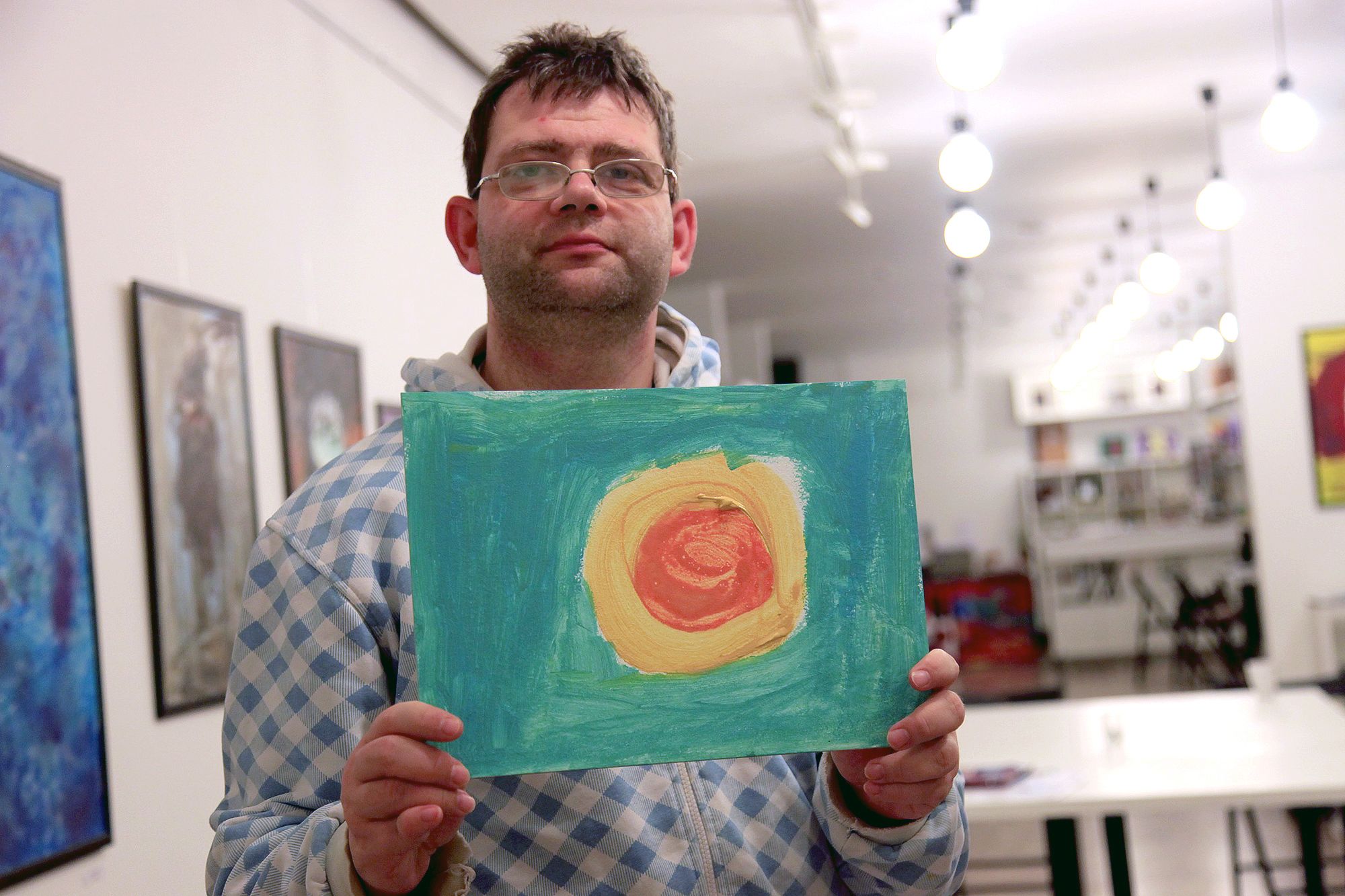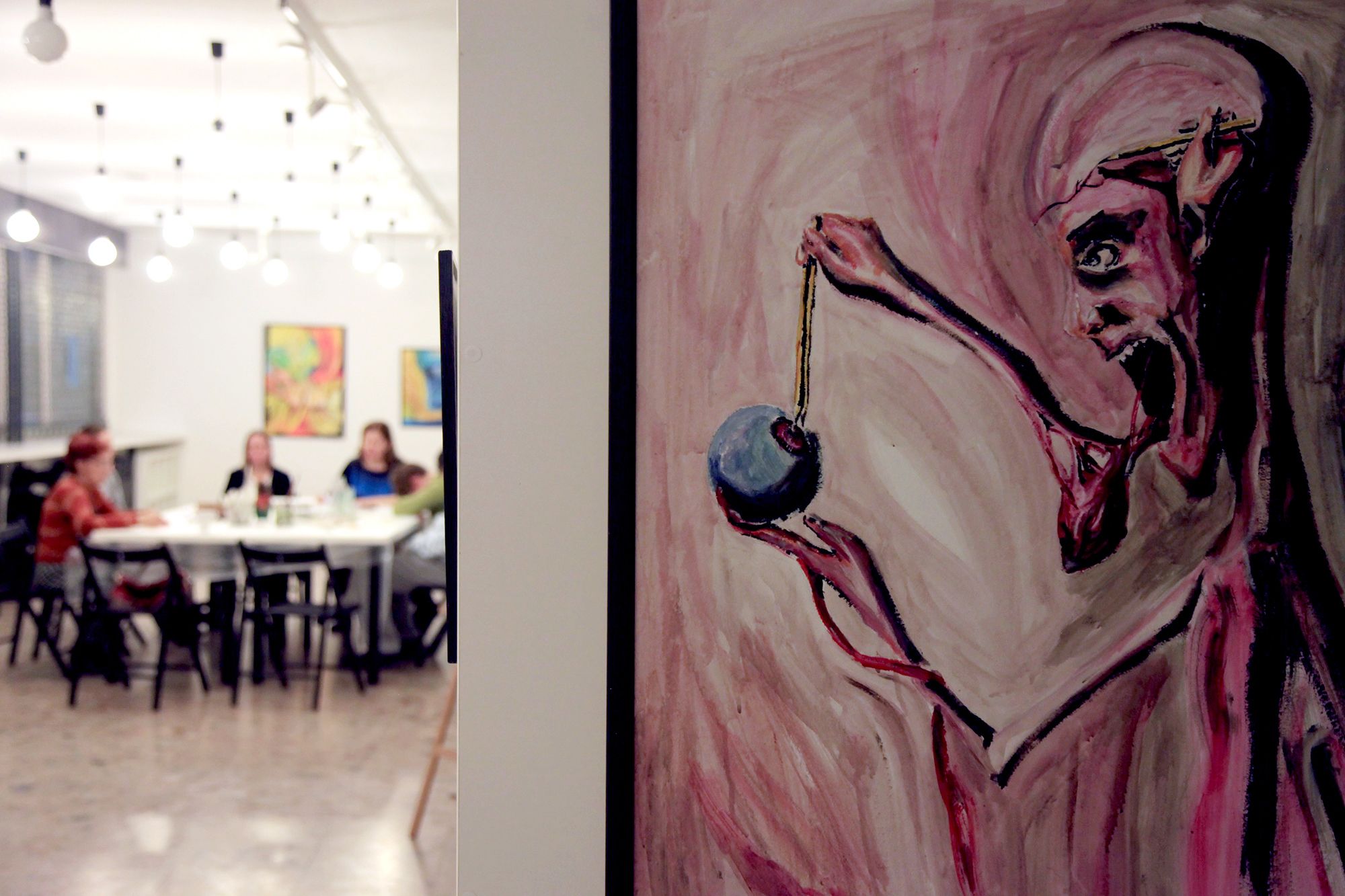 Beával saját festménye előtt beszélgettem. „Egy éve festek. A festésen keresztül azóta kicsit jobban eligazodom a világban. Diszlexiás és diszkalkuliás vagyok, ezért eddig nehezen kaptam munkát. A festésen keresztül nő az önbizalmam, amitől jobban megy például a számolás.“