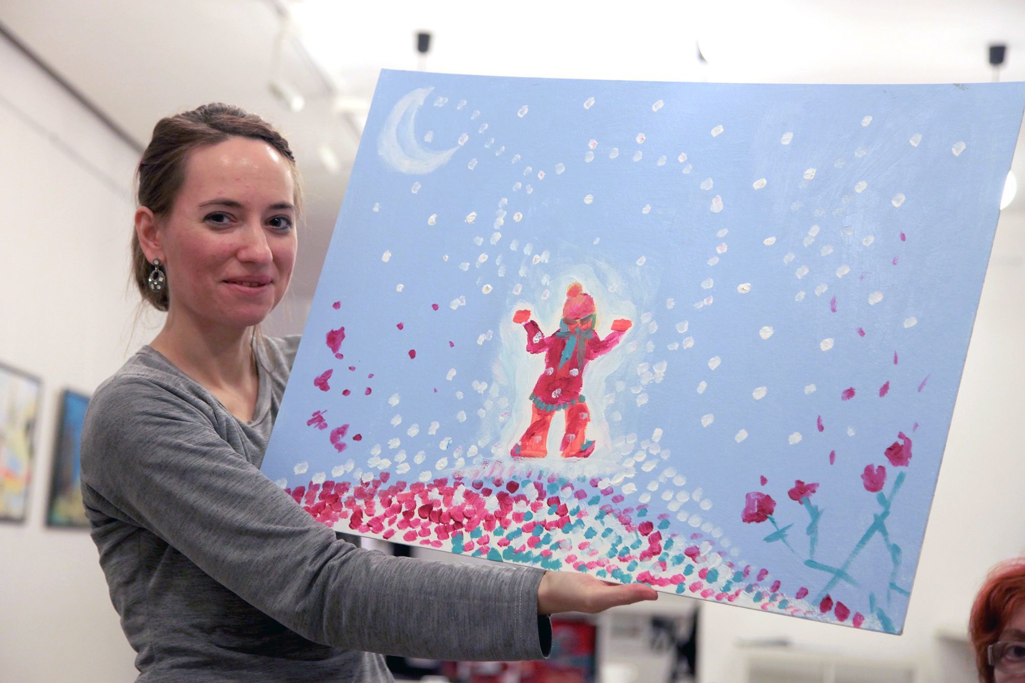 Zsuzsinak már több festményét is kiállították a galériában, mai alkotása a gyermekkorát idézi fel, amikor az első hóesés megérkezett, olyankor önfeledt játékba kezdett a kertben.