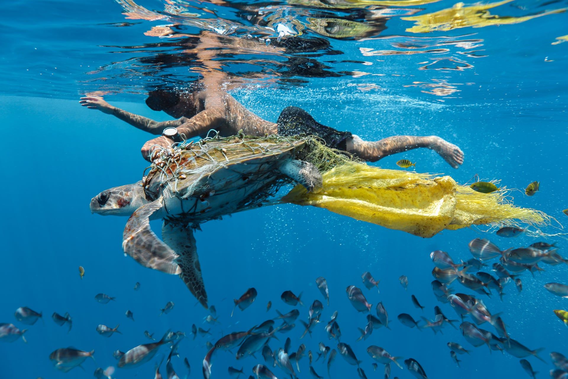 Szemétbe gabalyodott teknőst próbál kiszabadítani egy búvár (Fotó: Jing Li/2018 Ciwem environmental photographer of the year 2018)
