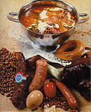 A csülköt kicsontozzuk, apró kockákra vágjuk, a debrecenit pedig karikákra, és a még forrásban lévő leveshez adjuk. Házilag készített csipetkével tálaljuk. Akinek a csipetke elkészítése még probléma lenne, főzhet ki külön vízben boltban készen kapható csipetkét.