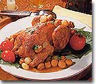 A fehérbort, a borecetet és Worcester-mártást összekeverjük, borssal ízesítjük. Az előkészített és megmosott csirkét beletesszük a boros páclébe, és legalább hat órán át hagyjuk hűtőszekrényben pácolódni. A pácléből kivett csirkét lecsurgatjuk, kívül-belül megsózzuk, tűzálló tálba téve az olajjal leöntve előmelegített sütőbe tesszük és folytonos locsolgatás mellett félig puhára sütjük. Ekkor hozzáadjuk a gyöngyhagymát, a gombát és készre sütjük. A csirkét kivesszük, pihentetjük, feldaraboljuk és a raguval leöntve, finomra vágott zöldpetrezselyemmel megszórjuk, forrón tálaljuk. Köretként zsírban sült burgonyát, gombás rizst vagy burgonyakrokettet adhatunk.