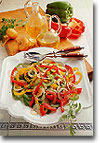 A paprikák magházát eltávolítjuk, a hagymát és a fokhagymát megtisztítjuk. A paprikát és a hagymát karikákra vágjuk, a fokhagymát péppé zúzzuk, a zöldpetrezselymet finomra vágjuk. Vizet forralunk, amelyet előzőleg megsózunk és a felszeletelt alapanyagokat leforrázzuk, 5-8 percig a forrázó vízben hagyjuk. Leszűrjük, kihűtjük. Közben elkészítjük az ecetes-olajos öntetet, amelyhez a zúzott fokhagymát és a durvára tört fehérborsot és a zöldpetrezselymet is hozzákeverjük. Az elkészített öntetet a kihűtött paprikára és hagymára öntjük. Fogyasztás előtt 2-3 órán át hűtőszekrényben tároljuk.