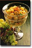 A szőlőt megmossuk, leszemezzük, vigyázva, hogy ne nyomjuk meg a szemeket. A dióbelet és a piros borsot durvára vágjuk. A porcukrot, a citromlével, a sóval, a likőrrel, és a darabolt dióval jól összekeverjük. Kb. fél liter vizet felforralunk, és pár másodpercre a leszemezett szőlőt beletesszük, leszűrjük, és hideg vízzel rögtön lehűtjük. A lehűtött szőlőt az elkészített öntethez adva lazán összekeverjük, poharakba adagoljuk, tetejét megszórjuk a durvára tört piros borssal, és fogyasztásig hűtőszekrénybe tesszük.