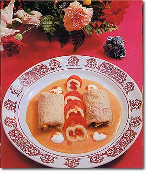 A vöröshagymát finomra, a húst apró kockákra vágjuk. A felhevített olajban a hagymát megfonnyasztjuk, a tűzről levéve belekeverjük a fűszerpaprikát, és hozzáadjuk a húst. Annyi vizet adjunk hozzá, hogy a húst ellepje, sózzuk és fedő alatt puhára pároljuk. Amikor megpuhult, tejfölös habarással sűrítjük, tejszínnel dúsítjuk, majd utánaízesítjük és átforraljuk. A húst kiszedjük, és finomra összevágjuk, kevés őrölt borssal ízesítjük. Az átszűrt mártásból annyit tesszünk bele, hogy kenhető legyen. Ezt a húsmasszát egyenletesen elosztjuk a palacsintákba, széleit felhajtjuk, összegöngyöljük. Tűzálló edénybe rakjuk, sütőben átforrósítjuk, és tálaláskor a forró paprikás mártással bevonjuk.