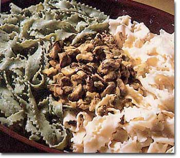 A tésztát külön – külön forró sós vízben kifőzzük, leszűrjük, leöblítjük és jól lecsepegtetjük. 40 g vajat felolvasztunk, hozzáadjuk a lisztet, és fehér habzásig hevítjük, majd felengedjük a kagylókonzerv levével, és kiforraljuk, ha besűrűsödik adjunk hozzá folyadékot, vagy valamilyen száraz fehérbort. Ha a rántásízt elfőtte, hozzáadjuk a tejszínt, a bazsalikomot, sózzuk, borsozzuk, felforraljuk. A kifőtt tésztát külön-külön a maradék vajon átforrósítjuk, és a tál két végébe helyezzük. A két tészta közé halmozzuk a megmelegített kagylót, amelyet átvonunk a mártással, és forrón tálaljuk.