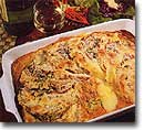 A kenyérszeleteket megpirítjuk, egy lapos tűzálló tálat kivajazunk. A kivajazott tálba felváltva rakjuk, hogy kissé fedjék egymást, a kenyeret, a sajtot és a sonkát. A tojásokat szétválasztjuk. A sárgáját a tejjel és a tejszínnel elkeverjük, fűszerezzük, hozzáadjuk az apróra vágott metélőhagymát. A fehérjét kemény habbá verjük, és lazán a tejszínes tömeghez keverjük. A masszát a tűzálló tálban lévő szeletekre öntjük, és előmelegített, forró sütőben megsütjük. Forrón salátával tálaljuk.