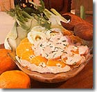 Az édesköménygumókat megtisztítjuk, a külső levélrészeket eltávolítjuk, és felszeleteljük. A narancsokat meghámozzuk, és a fehér hártyarészeket gondosan leszedjük, majd vékony karikákra vágjuk, a fokhagymát péppé zúzzuk, az édeskömény leveleit finomra vágjuk. Üvegtálba tesszük a gumószeleteket, ecettel vagy citromlével meglocsoljuk, sózzuk, borsozzuk, fokhagymával ízesítjük. Olajat csepegtetünk rá, majd óvatosan összekeverjük, és legalább fél óráig a pácban állni hagyjuk. A joghurtot a fűszerpaprikával és sóval összekeverjük. Tálaláskor rétegezzük a narancs- és a pácolt édesköményszeleteket. A felső sorokat elrendezzük, leöntjük az ízesített joghurttal, és kevés édesköménylevelet szórunk rá.