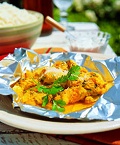 Az almát meghámozzuk, és lereszeljük. A sáfrányt a citromlébe áztatjuk. A joghurtot, a gyömbért, az almát, 3 evőkanál koriandert, a kókuszreszelék felét, csipetnyi sót és borsot összekeverünk, és tálalásig hűtőbe teszünk. 4 négyzet alakú alufóliát vajjal kikenünk. A húst a Delikát Szárnyas fűszerkeverékkel beszórjuk, majd felkockázzuk, a hagymát vékonyan felkarikázzuk. Salátástálban összekeverjük a hagymakarikákat, a citromlébe áztatott sáfrányt, a zúzott fokhagymát, a maradék koriandert és a kókuszreszeléket. Sóval, borssal ízesítjük, majd a húsra öntjük. A keveréket elosztjuk a fóliákon, és hermetikusan lezárjuk a csomagokat. Barbecue-sütőn 25 percig sütjük. Amikor kész, a fóliákat kinyitjuk, és tányérokra tesszük, de nem vesszük le a fóliáról. A mártást külön kínáljuk mellé.