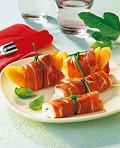 A friss sajtot szitába tesszük, lefedjük, és hűtőben hagyjuk lecsöpögni. Fél dinnye belsejét kikaparjuk, húsát 8 részre vágjuk, meghámozzuk. A fügéket négyfelé vágjuk. A hagymákat megtisztítjuk, és apróra vágjuk. 16 snidlingszárat félreteszünk. A maradék snidlinget és a bazsalikomot apróra vágjuk. A sonka zsíros részét eltávolítjuk. A lecsöpögtetett sajtot villával összetörjük, belekeverjük a bort, a fetát, a hagymát, a bazsalikomot és a snidlinget. Borssal ízesítjük. A sonkát kettévágjuk, mindegyikre 2 fügedarabot és 1 negyed dinnyét teszünk. Roládként feltekerjük, 1-1 snidlingszárral átkötjük. A maradék sonkákra tesszük, újra felcsavarjuk, és ismét snidlinggel átkötjük.