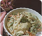 A csirkecombokat megtisztítjuk, sóval bedörzsöljük, és állni hagyjuk. A spárgát megtisztítjuk, és kisebb darabokra vágva kevés cukros, sós vízben megfőzzük, leszűrjük és félretesszük. A zöldségeket megtisztítjuk, kockára vagy hasábokra, a zöldpetrezselymet finomra vágjuk. A vajban a petrezselymet megfonnyasztjuk, belerakjuk a csirkecombokat és kevés víz aláöntésével félpuhára pároljuk. Hozzáadjuk a zöldségeket, sózzuk, borsozzuk, és együtt puhára pároljuk, majd zsírjára lepirítjuk. Liszttel megszórjuk, kissé megpirítjuk, és felengedjük forró tejjel és tejszínnel. Jól kiforraljuk, ízesítjük kevés citromlével. Tálaláskor meghintjük finomra vágott petrezselyemzölddel, burgonyapürét vagy párolt rizst adhatunk hozzá.