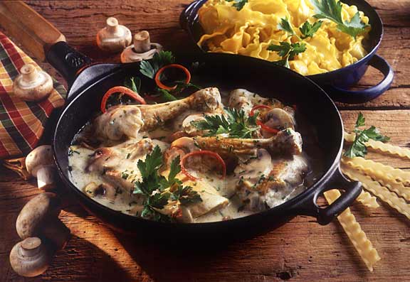 Nem erős tűzön, letakarva a húst, mártásban pároljuk puhára. A sós vízben kifőzött szélesmetéltet leszűrjük, és forró vajjal elkeverve átforrósítjuk. Köretnek ezt a vajas metéltet kínáljuk.