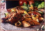Tálaláskor a tálra felhalmozzuk a zellerpürét, mellé helyezzük a pirított csirkét, amelyek tetejére ízlésesen ráhelyezzük a sült almakarikákat.