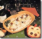 A tejfölt a tejszínnel és kevés, a gyümölcshöz illő lével összekeverjük, enyhén sózzuk. A hússzeleteket megsózzuk, bekenjük az olajos fűszerkeverékkel és a hússzeletek felét tűzálló edény aljára tesszük. Befedjük a gyümölcs, a vöröshagyma, és a szalonna felével, erre tesszük a maradék hússzeleteket, valamint az egyéb anyagok másik felét. Ráöntjük a tejszínes keveréket, megszórjuk a reszelt sajttal és sütőben lassan készre sütjük.