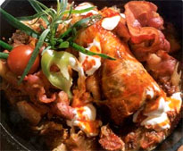 A debrecenit bevagdossuk, a szalonnából négy egyforma szeletet vágva kakastaréjt készítünk (a szalonnát hosszában majdnem bőréig bevágjuk, majd erre merőlegesen kockázzuk), és serpenyőben kisütjük. A visszamaradó zsírban a debrecenit megsütjük. Ha a káposzta megpuhult, a tölteléket kivesszük, az aprókáposztát tejfeles habarással besűrítjük, kiforraljuk. Tálaláskor a tál aljára rakjuk az aprókáposztát, ráhelyezzük a tölteléket, mellétesszük a sült bordát, debrecenit és a kakastaréjt. Tejföllel és finomra vágott kaporral díszítve forrón tálaljuk.