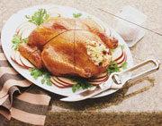 Ezután a csirkét körberakjuk a többi krumplival és almával. A csirkére is rakhatunk egy kevés vajat. Az étel csak enyhe fűszerezést igényel, mivel a zamatot a vaj, az almából kisült lé és a csirke természetes ízének keveréke fogja megadni. A tálra ráhelyezzük a tetejét, és hideg sütőbe tesszük. (Erre azért van szükség, mert a cseréptálnak lassan kell felmelegednie, ha forró sütőbe helyezzük, esetleg elrepedhet.) Közepesnél nagyobb lángon minimum 40 percig sütjük, a csirke általában eddigre megpuhul. Sütés közben 10-15 percenként a csirkét a tál alján képződő ízletes szafttal meglocsoljuk. Az étel akkor van kész, amikor a csirke belsejében lévő krumplik is megpuhultak (kb. 1 óra).