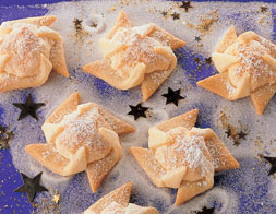Tészta: A lisztet egy keverőedénybe szitáljuk, a többi hozzávalót is hozzáadjuk és egy konyhai robotgéppel (dagasztó spirál) először alacsony, majd a legmagasabb fokozaton addig verjük, amíg egynemű tésztát nem kapunk. A tésztát megfelezzük, és mindkét részt egy kb. 23 x 23 cm-es négyzetté nyújtjuk, majd kis négyzetekre (4,5 x 4,5 cm) vágjuk. A kis négyzeteket egy sütőpapírral kibélelt tepsibe helyezzük, és egy éles késsel a sarkokat kb. 1 cm hosszan bevágjuk.