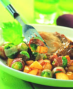 A kelbimbót sós vízben puhára főzzük, hideg vízzel leöblítjük, lecsöpögtetjük, és konyhai papírtörlővel szárazra töröljük. A szalonnaszeleteket hosszában kettévágjuk. Minden szalonnadarabba egy kelbimbót göngyölünk, és fogvájóval megtűzzük. A burgonyát meghámozzuk, és felkockázzuk. A vaj felében pirosra sütjük, közben a zúzott fokhagymát is hozzáadjuk, és sóval, borssal ízesítjük. Másik lábasban a kelbimbótekercseket a maradék vajban átsütjük, majd a szerecsendióval együtt a burgonyához adjuk, és még 5 percig sütjük. Közben az olajban a húsokat körben aranyszínűre pirítjuk, majd sóval, borssal meghintjük. Tányérokra tesszük, a kelbimbóval és a burgonyával körítjük.