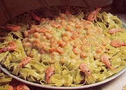 Tedd bele a lisztet és a fűszereket. Add hozzá a tejet, vagy a tejes bort. 3-4 percig főzd, néha megkeverve. Tedd hozzá a rákot, és 1-2 perc alatt hevítsd fel. A tésztát rendezd egy tálra, öntsd rá a szószt, és díszítsd a megmaradt rákokkal. Melegen tálald.