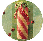 A marcipánmasszát három egyenlő részre osztjuk. Az egyik harmadot pirosra, a másikat zöldre festjük. A festetlen harmadot és a piros marcipánt vékony csíkokra vágjuk, a zöld marcipánból leveleket formálunk, és fogpiszkálóval levélmintákat rajzolunk rá. A marcipánmotívumokat dekoratívan a tekercsre helyezzük.