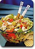 Az összevágott anyagokat keverőtálba tesszük, ráöntjük a dresszinget, és óvatosan összekeverjük. Pár órára hűtőszekrénybe tesszük, hogy az ízek összeérjenek. Pirított zsemleszeleteket vagy friss kenyeret adhatunk mellé.