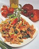 A tésztát sós vízben kifőzzük. A paprika magját és ereit eltávolítjuk, a húsát apróra vágjuk, és a hagyma fehér szárával együtt, 2 kanál olaj hozzáadásával addig turmixoljuk, amíg pépes lesz. A paradicsomot pár percre forró vízbe tesszük: ha a héja berepedezik, kivesszük, hideg vízbe mártjuk, és meghámozzuk. Két paradicsomot a paprikakrémhez adunk, és még egyszer turmixoljuk. A maradék olajban megfuttatjuk az apróra vágott fokhagymát. Hozzáadjuk a paprikakrémet, megszórjuk Delikáttal, és nagylángon 5 percig tovább főzzük. A főtt tésztát leszűrjük, a mártáshoz keverjük, és megszórjuk reszelt sajttal, borssal, valamint a megmaradt, felkockázott paradicsommal. Tépett bazsalikomlevelekkel díszítjük.