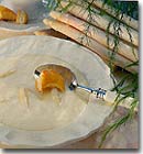 A spárgát meghámozzuk, fejét levágjuk és 1-2 cm-es darabokra vágjuk. A forrásban lévő vízben a húsleveskockát feloldjuk, és a spárga héját megfőzzük benne. Leszűrjük, majd a levet sóval, cukorral ízesítve felforraljuk, és ebben főzzük puhára a darabolt spárgát. A spárgafejeket külön főzzük sós-cukros vízben. A vajat felolvasztjuk, hozzáadjuk a lisztet, fehér habzásig hevítjük (fehér rántás). A tűzről levéve hideg vízzel és a tejjel felengedjük. A spárgalevest, – valamint a hozzá szűrt spárgafej főzőlevet – ezzel besűrítjük, kiforraljuk, majd szitán áttörjük, utána ízesítjük sóval, cukorral, citromlével. A tejszínt a tojássárgájával elkeverjük, és az áttört leveshez adjuk, dúsítjuk. Tálaláskor a tányérba vagy csészébe tesszük a fejeket, majd rámerjük a forró levest.