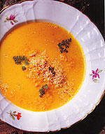 A sárgarépát megtisztítjuk, és finomra reszeljük, a leveskockát fél liter vízben feloldjuk. A répát forró olajon közepes tűzön megfuttatjuk, felöntjük a zöldséglevessel, majd ízesítjük sóval, borssal és jól felforraljuk, végül a tűzről levéve, hűtjük, hozzákeverjük a joghurtot, és 5 percig gyenge tűzön főzzük. Közben a szezámmagot egy teflonserpenyőben zsiradék nélkül aranyszínűre pirítjuk. Tálaláskor a finomra vágott sárgarépazöldet és a pirított szezámmagot külön edényben adjuk a leves mellé, és ki-ki ízlése szerint vesz belőle.