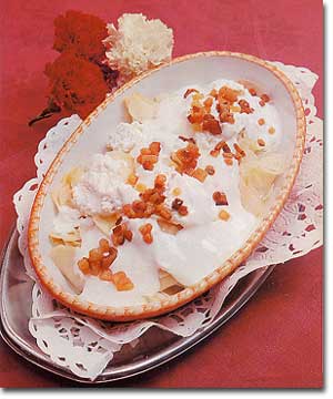 Leszűrjük, leöblítjük, jól lecsurgatjuk, és tűzálló tálban a szalonna zsírjával összekeverjük ha szükséges megsózzuk tetejére tesszük a szétmorzsolt túrót, a tejfölt és a kisütött szalonnát. Sütőbe vagy mikróba téve átforrósítjuk, és így tálaljuk.