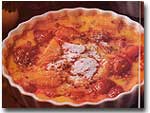 A kihűlt szirupban elkeverjük a likőrt, egyenként a tojásokat, végül a tejszínt, és a gyümölcsök tetejére locsoljuk. 220 °C -ra előmelegített sütőbe tesszük, és 15 percig, enyhe pirulásig sütjük. Tetejüket megszórjuk vaníliás porcukorral, azonnal tálaljuk.