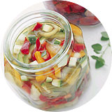 Az előkészített zöldségeket jól összekeverjük és üvegekbe rakjuk. A léhez kimérjük, majd összekeverjük a vizet, a fehérbort, az almaecetet és a cukrot. Hozzáadjuk még a citrom kifacsart levét és a savanyúságtartósítót. Az elegyet felforraljuk és 3 – 5 percig forrni hagyjuk. A zöldségeket a még forró lével leöntjük egészen az üveg pereméig. Az üveget jól lezárjuk és kihűlés után száraz, hűvös helyen tároljuk. Ügyeljünk arra, hogy a fehérbor (minőségtől függően) befolyásolhatja (némileg lerövidítheti) a savanyú eltarthatóságát.