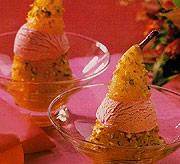 A szirupot áttörjük. A körtéket desszertestálkákba állítjuk, rárakjuk a „kalapokat”, és a sziruppal meglocsoljuk. Rögtön rászórjuk a pisztáciát a körtékre úgy, hogy mindenhol ráragadjon a gyümölcsökre.