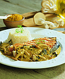 A gyömbért meghámozzuk és lereszeljük. Egy serpenyőben a vajban a curryt és a gyömbért 1 percig sütjük, majd hozzáadjuk az apróra vágott hagymát, és üvegesre pároljuk. A gombát is a hagymához adjuk, sóval ízesítjük, és félpuhára pároljuk. Kevergetve apránként beleöntjük a kókusztejet, és készre főzzük. Közben a lazacszeleteket olajjal megkenjük, sóval, borssal meghintjük, és grillen pirosra sütjük. Tányérokra osztjuk, a currys gombával leöntjük, és kaporral díszítve, rögtön tálaljuk