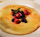 A lisztet és az élesztőt keverőtálba szitáljuk, majd hozzáadjuk a vaníliáscukrot. A közepébe mélyedést csinálunk, ebbe öntjük lassan a tej felét, majd a tojássárgákat is beledolgozzuk, végül a maradék tejet és a vizet is a tésztába keverjük. 1 óráig állni hagyjuk. A banánt meghámozzuk, húsát összetörjük, 2 percig sütjük a vajban, majd a tésztába keverjük. A tojásfehérjét kemény habbá verjük, és óvatosan ezt is a masszához adjuk. Kiolajozott serpenyőben 12 palacsintát sütünk, és forró vízzel telt edény fölött melegen tartjuk, míg mindegyik elkészül. A gyümölcsöket megtisztítjuk, megmossuk, lecsöpögtetjük. A palacsintákra gyümölcsöt halmozunk, és ízlés szerint porcukorral vagy mézzel a tetejüket megszórjuk vagy meglocsoljuk.