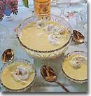8 dl vizet a szegfűszeggel, a fahéjjal és a citrom vékonyan lehámozott héjával felforralunk, majd hozzáöntjük a bort és együtt tovább forraljuk. Közben négy tojássárgáját a cukorral habosra keverünk, a felforralt folyadékból hozzámerve elkeverjük, és a boros vízhez adjuk, állandó keverés közben még egyszer felforraljuk. A tűzről levéve, állandó keverés közben hozzáadjuk a 3 dl tejszínnel elkevert maradék tojássárgáját. A kész levest lehűtjük és hűtőszekrénybe tesszük. Tálaláskor a maradék tejszínből vert tejszínhabbal díszítjük és meghintjük őrölt fahéjjal.