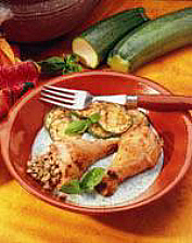 A combokat éles késsel hosszában bemetsszük úgy, hogy a csontokat kivehessük. A májat és a szalonnát ledaráljuk. A hagymát és a gombát apróra vágjuk, majd a darált húsokkal együtt a vajban megpároljuk. A szárnyas fűszerkeverékkel ízlés szerint fűszerezzük, hozzáadjuk az ecetet, és összeforraljuk. A combokat megtöltjük, formára igazítjuk, a tyúkhúslevesben megpároljuk (kb. fél óra), majd kivesszük, és pirosra grillezzük. A maradék levest a felére forraljuk. A bazsalikomleveleket nagyon apróra vágjuk, és simára keverjük az olajjal. A tejfölt a sűrű leveshez adjuk, majd a bazsalikomos olajjal simára keverjük. A combokat ezzel a szósszal tálaljuk.