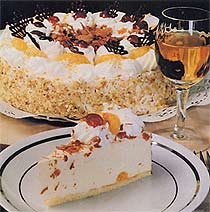 A már kihűlt piskótát megkenem a krémmel, és hűtőbe teszem. Három-négy óra múlva a torta oldalát megszórom apróra vágott, pörkölt mandulával. A tetejét zselatinnal kevert, kemény habbá vert tejszínnel díszítem, kirakom a félretett gyümölccsel, és rászelem a csokoládét.