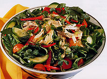 Keverd össze a csirkehúst a spenóttal és a többi hozzávalóval egy nagy edényben. Az öntetet csak közvetlenül tálalás előtt, melegen add hozzá.