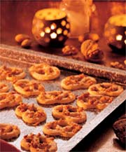 A tésztához a lisztben elvegyítjük a sütőport, és egy keverőedénybe szitáljuk. Hozzáadjuk a többi hozzávalót, és egy konyhai robotgéppel (dagasztó spirál) először alacsony, majd a legmagasabb fokozaton jól összedolgozzuk. (Ha a tészta ragad, tegyük kb. 30 percre hideg helyre.) Enyhén belisztezett munkalapon 2-3 mm vékonyra nyújtjuk, és egy perec alakú kiszúróval kiszaggatjuk. A pereceket egy sütőpapírral kibélelt tepsibe helyezzük. A tojássárgáját felverjük a tejjel, és megkenjük vele a pereceket, majd a grillázzsal megszórjuk.