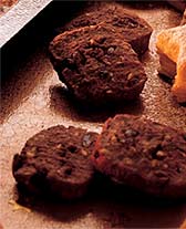 A rumba beáztatjuk a mazsolát. A lisztben elvegyítjük a kakaóport és a sütőport, és egy keverőedénybe szitáljuk. Hozzáadjuk a többi hozzávalót (a mazsolát és a mandulát csak a legvégén keverjük bele), és egy konyhai robotgéppel (dagasztó spirál) először alacsony, majd a legmagasabb fokozaton jól összedolgozzuk. Ha kész, a tésztát megfelezzük, és két négyszögletes rúddá (30 cm hosszú) formáljuk.