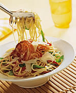 A tarját sütőpapírba csomagoljuk, meleg sütőben, rácson megsütjük, és kihűtjük. A paprikákat gőzben 15 percig pároljuk, majd műanyag zacskóba tesszük, és 10 percig állni hagyjuk. A zacskóból kivesszük, meghámozzuk, magjaikat kikaparjuk, húsukat vékonyan felszeleteljük. A spagettit sós vízben kifőzzük. A zsázsát, a spenótot és a hagymát apróra vágjuk. Az olajat simára keverjük a joghurttal, a köménnyel és az ecettel, majd sóval, borssal ízesítjük. A spagettit összekeverjük a petrezselyemmel, a spenóttal, a hagymával, és a paprikával. Az ecetes szósszal meglocsoljuk, és tányérokra adagoljuk. A tarját a tetejére aprózzuk, erre szórjuk a kis darabokra vágott sajtot, és rögtön tálaljuk.