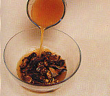 1. Tegyük a szárított gombát egy tűzálló tálba, öntsük rá a forró vizet, és hagyjuk állni 30 percig. Utána csavarjuk ki a gombát, tegyük félre a levét, daraboljuk fel a gombát.