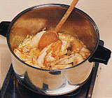 3. Forrósítsuk fel a vajat és az olajat egy serpenyőben, tegyük bele a húst, és kissé pirítsuk meg. Tegyük hozzá a hagymát, fokhagymát, és pároljuk addig, amíg a hagyma meg nem puhul.