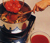 4. Adjuk hozzá a levest és a gomba levét, a gombát, a paradicsomokat, és fedő nélkül, néha megkeverve, kb. 30 percig főzzük, amíg a csirke meg nem puhul.